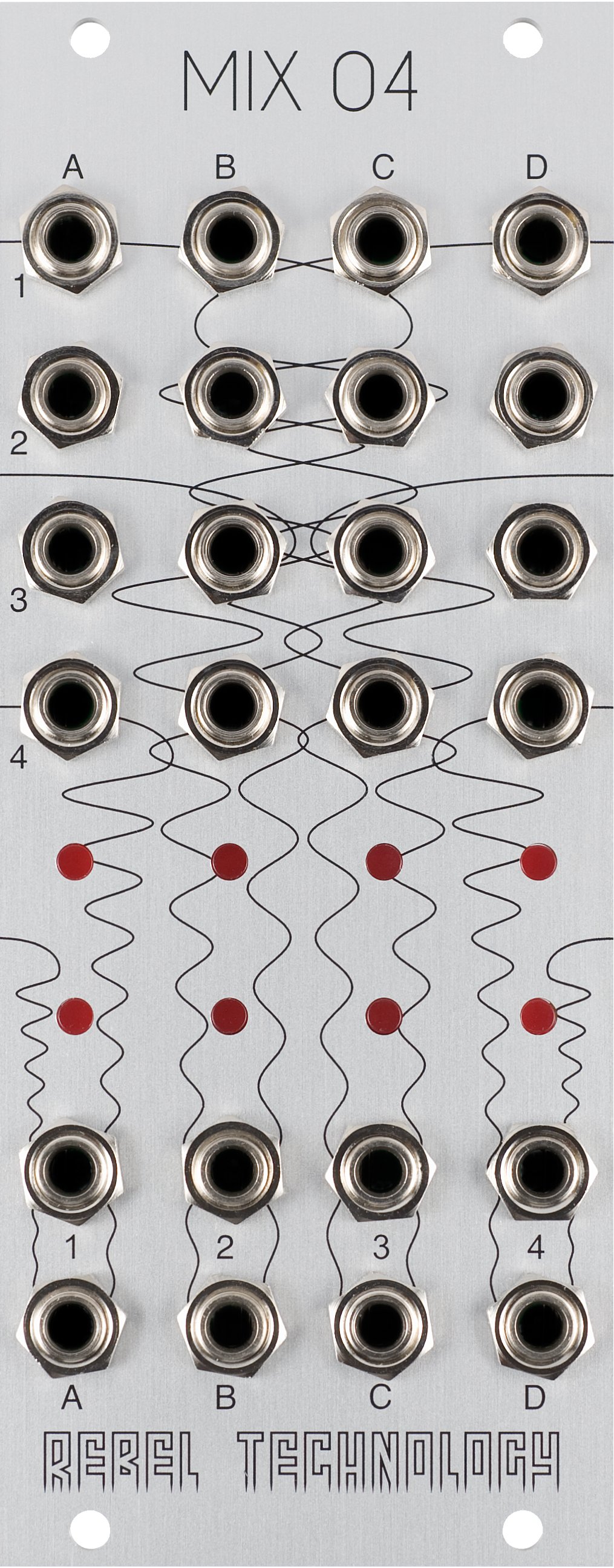 Mix 04 features the new Rebel Technology analogue bus, allowing compatible modules to be interconnected without additional patching. Connect two or more Mix modules to create a mixer with more inputs and outputs. Balanced inputs and outputs can also be added, either for front panel mounting or built in to the modular case.